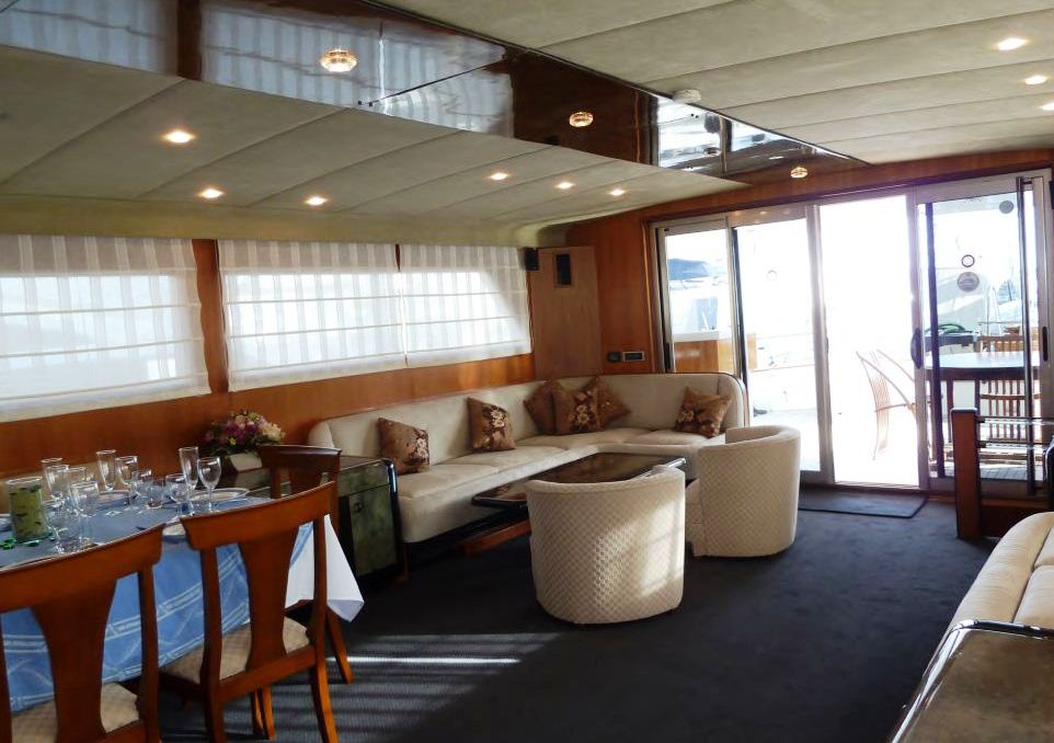 She has a cockpit seating area for 12 guests and a dining area on the fly bridge which can also accommodate 12 guests. The alfresco bar on the fly bridge seats 6 guests with an additional bar in the aft cockpit area on the main deck.