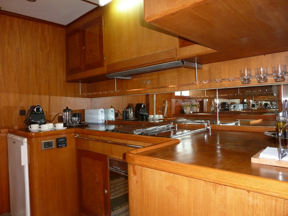 The extensive galley equipment includes 2 refrigerators, freezers, electric oven, microwave, electric griddle, drinks cooler, and an icemaker.