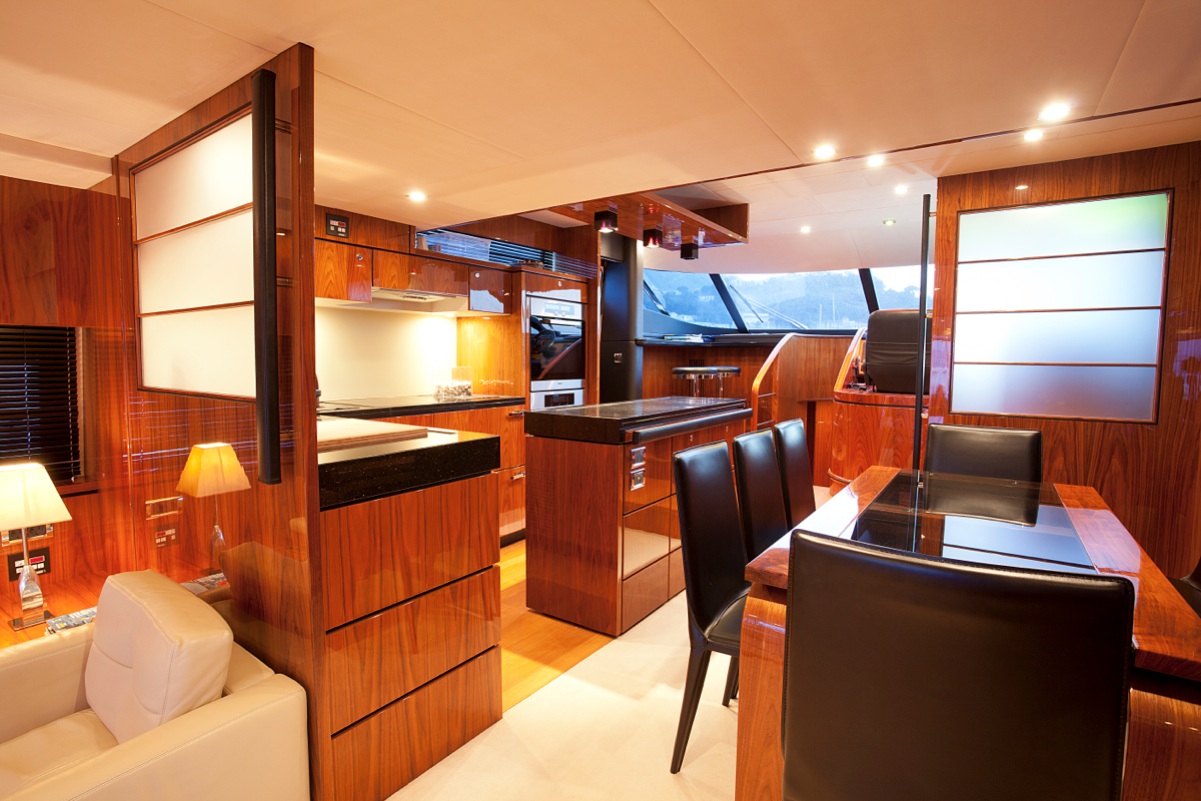 The XKE yachts dining room and galley are integrated with the saloon to create a light, sociable area.