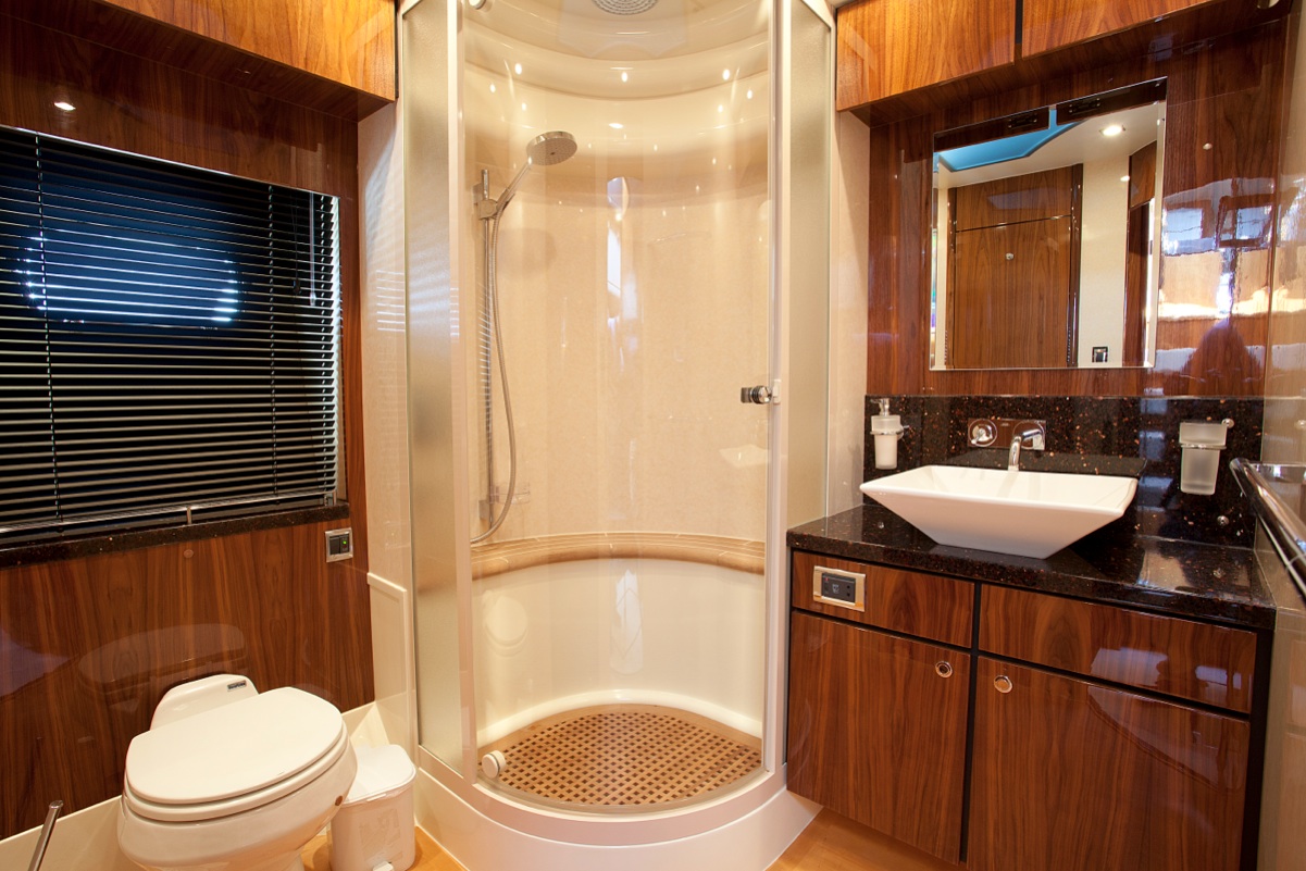 The magnificent master stateroom spans the entire width of the motor yacht and comprises an en-suite dressing room, as well as a bathroom with a large walk-in shower.