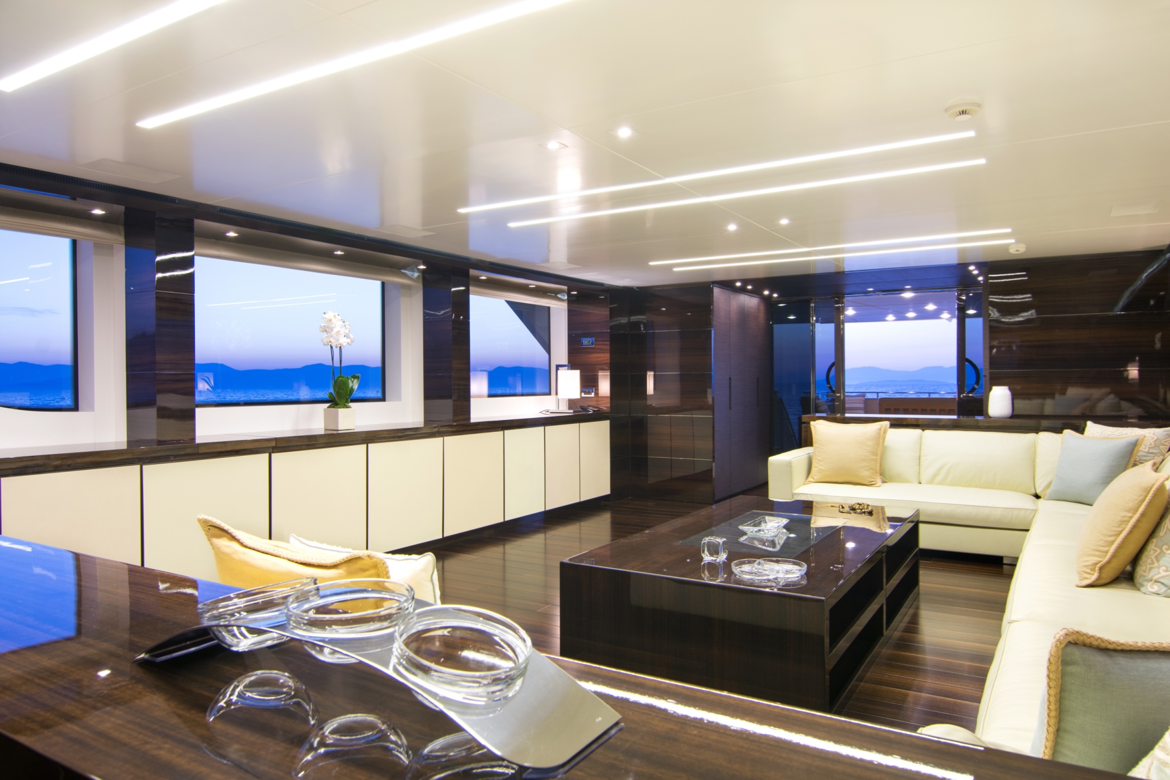 Her main aft deck is shaded featuring a lovely casual seating arrangement. On the upper deck, dine alfresco or simply unwind on the built-in seating area. There is a foredeck space with dual sunpads in a raised position, as well as an intimate bow seating nook with a small table.