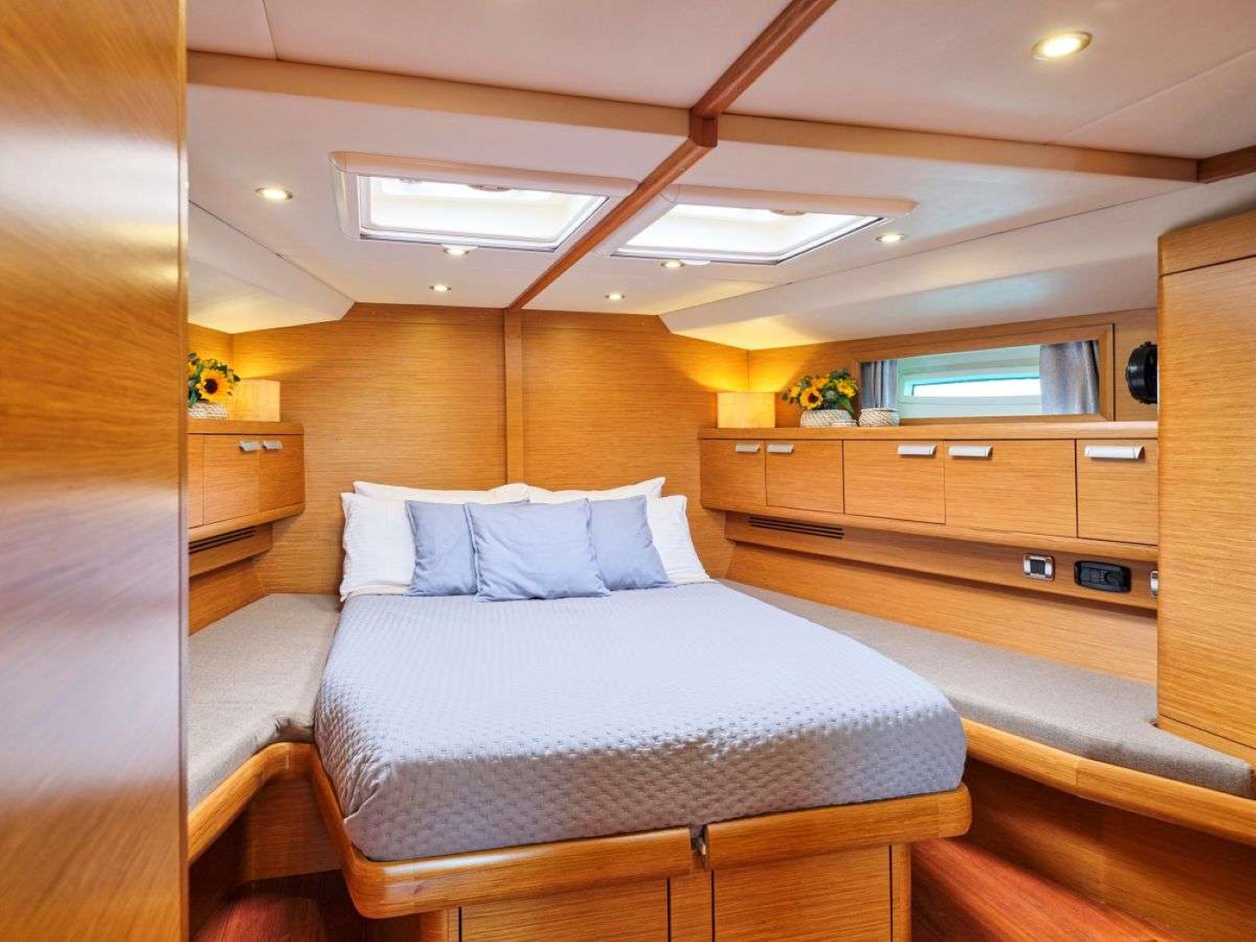 The salon and dining are an open plan with the formal dining to starboard and lounge space to port. Elongated side windows and overhead hatches infuse the space with light. Aft of the lounge, the open galley also doubles as a wet bar, ideal for entertaining.