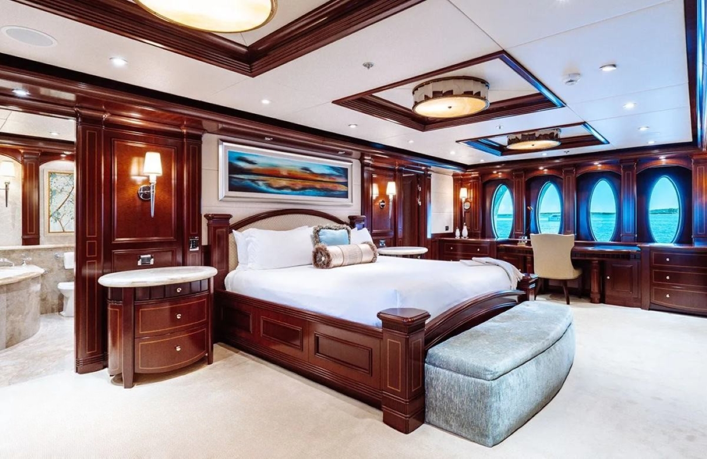 The master stateroom is on the main deck, forward of the salon and dining, with a king size bed, wool silk carpets, his and hers desks, his and her ensuites and a deluxe soaker tub. On the upper deck is an additional master stateroom with a king size bed, vanity, sofa, Jacuzzi and his and hers ensuite.