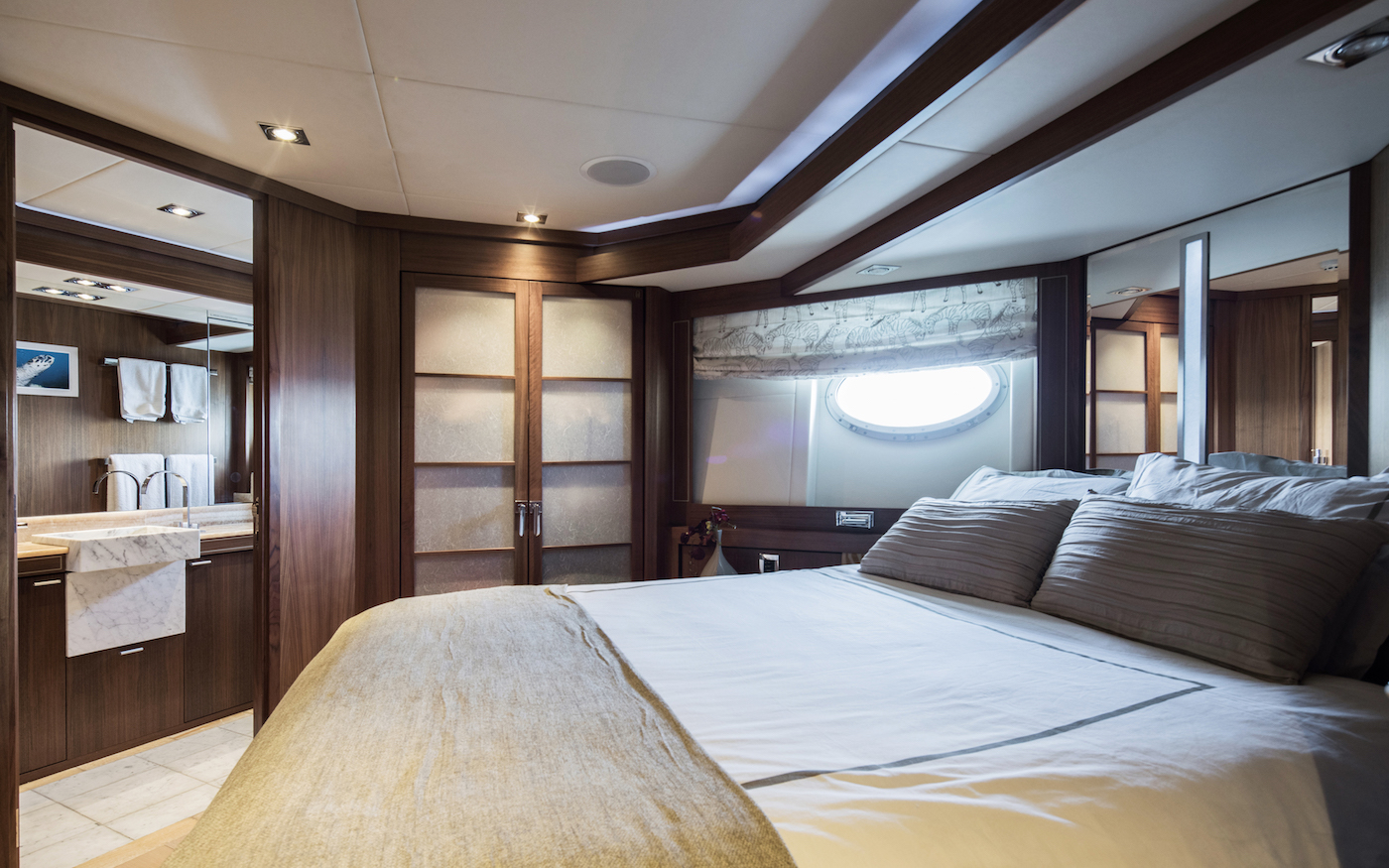 The master suite is full beam of the yacht forward featuring a king size bed, his and her facilities, sofa, vanity and heaps of space. 2 VIP cabins are amidships on port and starboard with queen size beds and en-suite facilities. A further twin bunk bed cabin is to port with en-suite facilities.