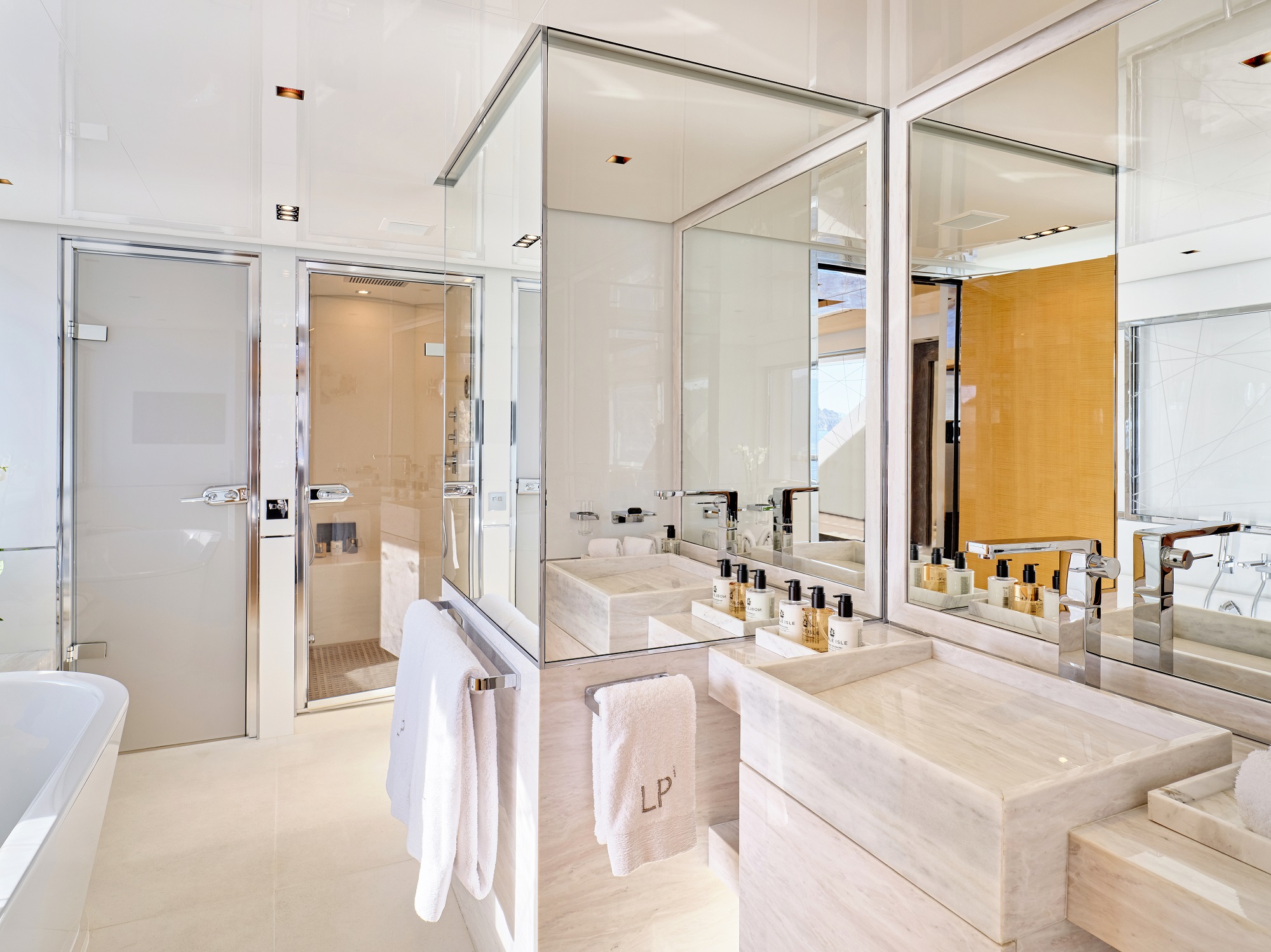 The master suite is aft of the pilot house and full beam of the yacht featuring an island style king size bed, sofa, table and seating, walk in wardrobe, and en-suite facilities with his and hers sinks and a tub.