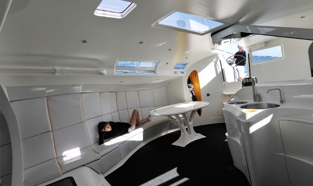 The award-winning interior design modernizes the appearance of boat layouts with an elegant style, mixing round forms and taut lines. JP54’s galley is custom-built, with each aspect carefully designed into the interior.