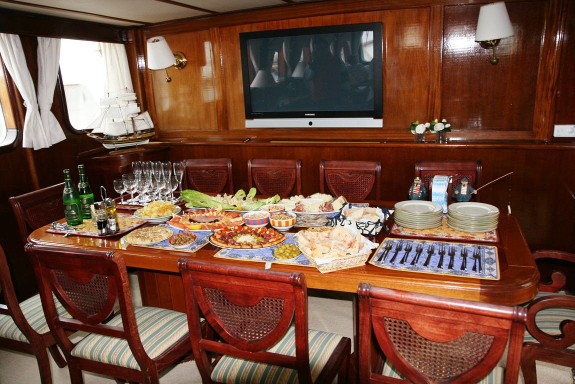The SOUTHERN CROSS sailing yacht has a large main salon with a formal dining area and a bar. She also has a large al fresco dining table covered by a hard top on the aft deck, ideal for all weather conditions.