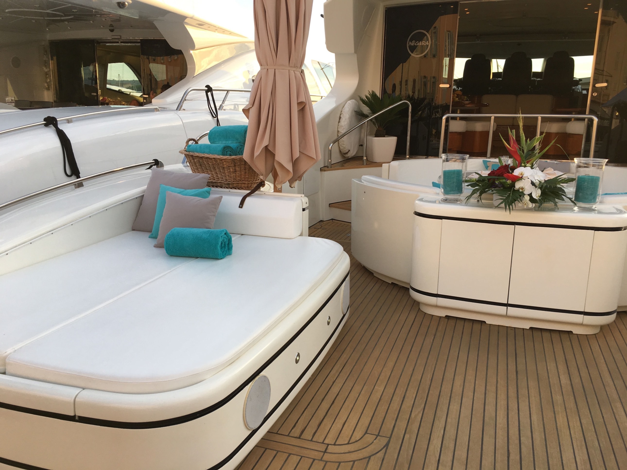 The yacht NEGARA benefits from an additional interior saloon forward of the driving position as well as the more usual “open” saloon aft, while still having the sleek looks of a fast open motor yacht.