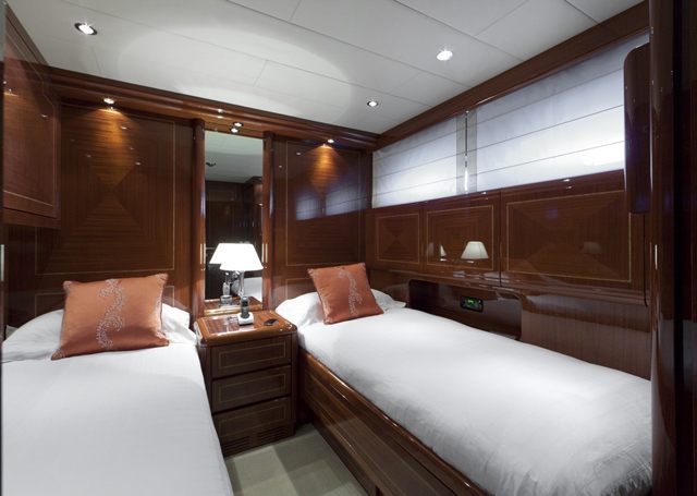 The Mangusta 72 OUTSIDE EDGE IV is able to accommodate up to 6 charter guests in 3 well-appointed cabins all offering ensuite facilities.