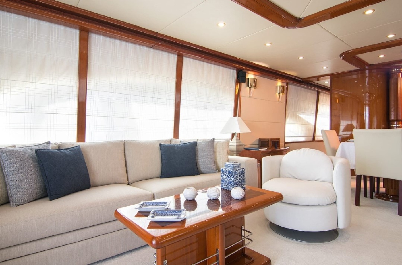The salon offers 2 large deep blue leather settees with coffee tables, light cream carpeting and high gloss cherry woods, the entire space receives ample natural light through large windows. Forward of the salon in an open plan, the formal dining area features a minimalistic clear glass table with high back cream leather chairs.