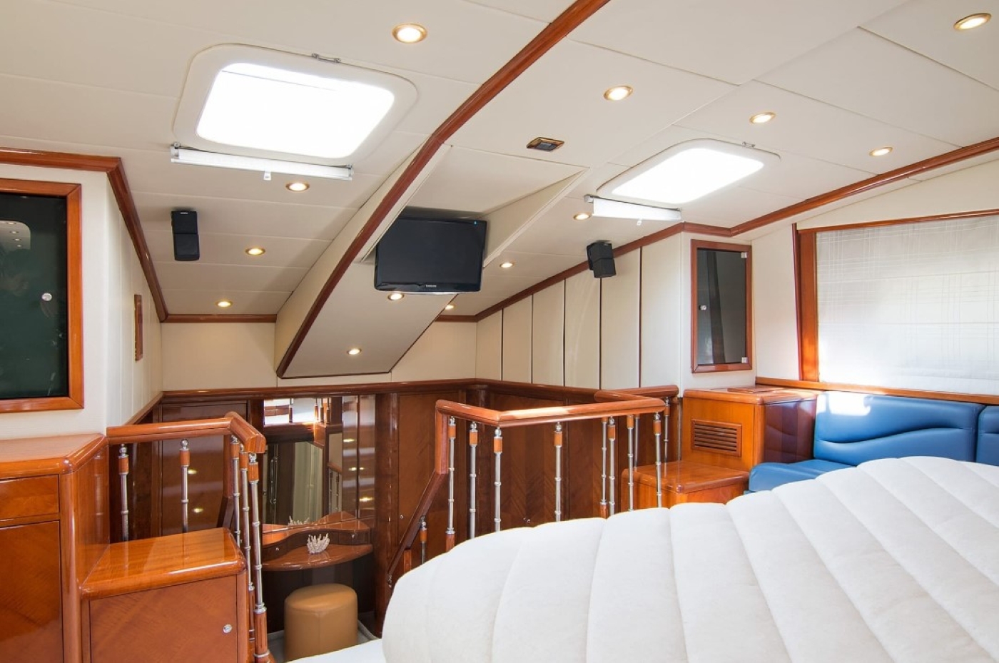 The DREAM B motor yacht has a classy interior. The salon offers 2 large deep blue leather settees with coffee tables, light cream carpeting and high gloss cherry woods, the entire space receives ample natural light through large windows.