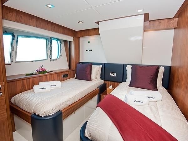 The Sunseeker 88 yacht OOMKA is able to accommodate up to 8 guests in 4 cabins including a master cabin, a VIP Cabin and 2 convertible (double or twin). All cabins have TV local channels and DVD player. There is a large selection of movies available on hard drive.