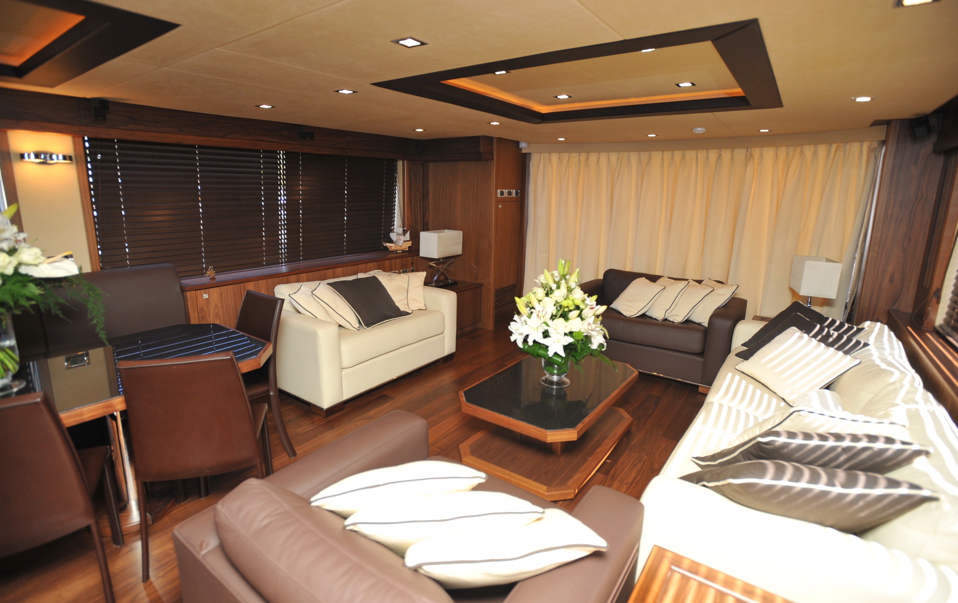 This Sunseeker 88 motor yacht GATSBY boasts a beautiful and spacious open plan salon, dining and seating area, which opens up into a sizable aft deck offering a large al fresco dining table and a comfortable seating area.