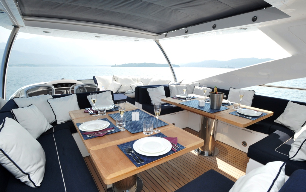 This Sunseeker 88 motor yacht GATSBY boasts a beautiful and spacious open plan salon, dining and seating area, which opens up into a sizable aft deck offering a large al fresco dining table and a comfortable seating area.