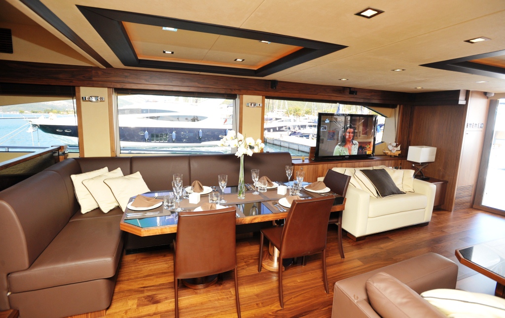 This Sunseeker 88 motor yacht GATSBY boasts a beautiful and spacious open plan salon, dining and seating area, which opens up into a sizable aft deck offering a large al fresco dining table and a comfortable seating area.