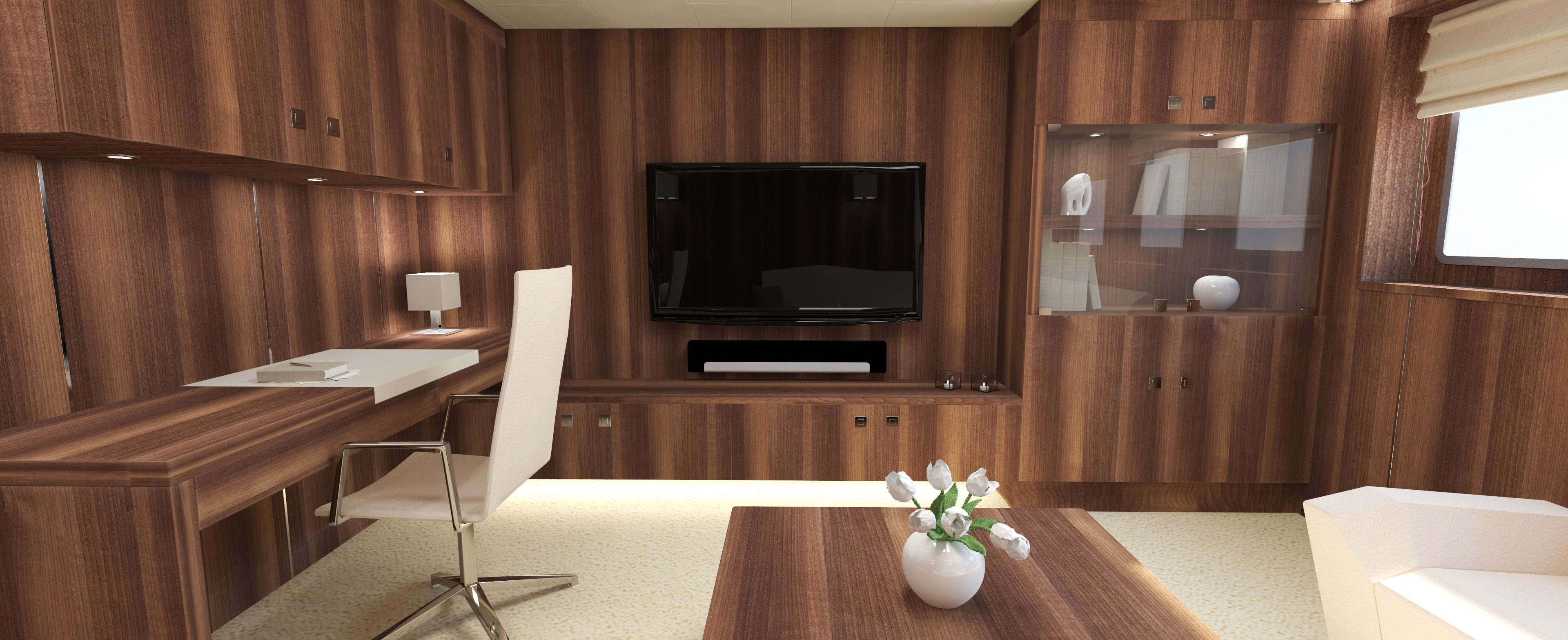 The upper deck had the walls removed as well, thus creating a comfortable TV room adjacent to a large sun-lounge incorporating comfortable leather lounges.