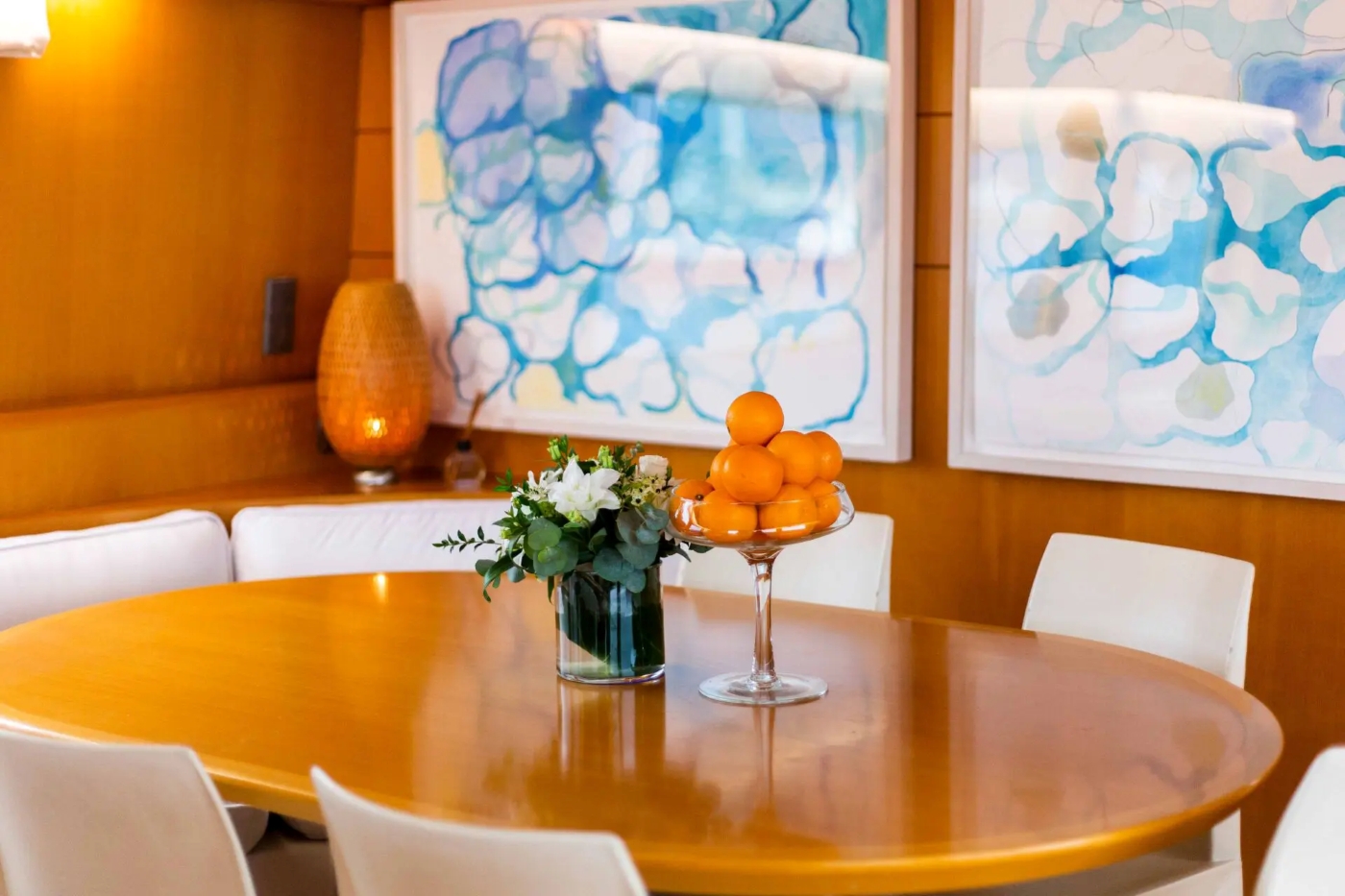 The salon and dining are an open plan with a low divider separating them, the salon is adjacent to the generous aft deck through sliding glass doors, a sofa and coffee table sit to port while an entertainment system is on the ...