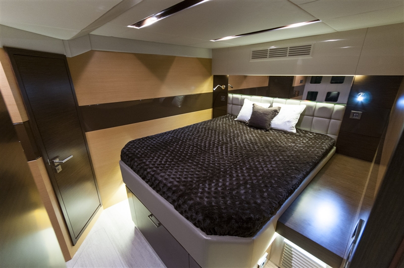 The interior of the main deck provides the galley and a dining area, while a mezzanine floor situated in the midship features the internal helm station and lounge, ...
