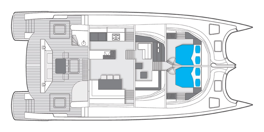 The interior of the main deck provides the galley and a dining area, while a mezzanine floor situated in the midship features the internal helm station and lounge, ...