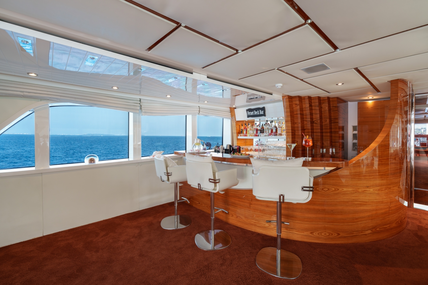The spacious and airy main saloon is equipped with a bar, a comfortable sofa, chaise lounges and an elegant dining area. The skylounge has a large U-shaped couch with further seating options that allow guests to relax comfortably around two small coffee tables.