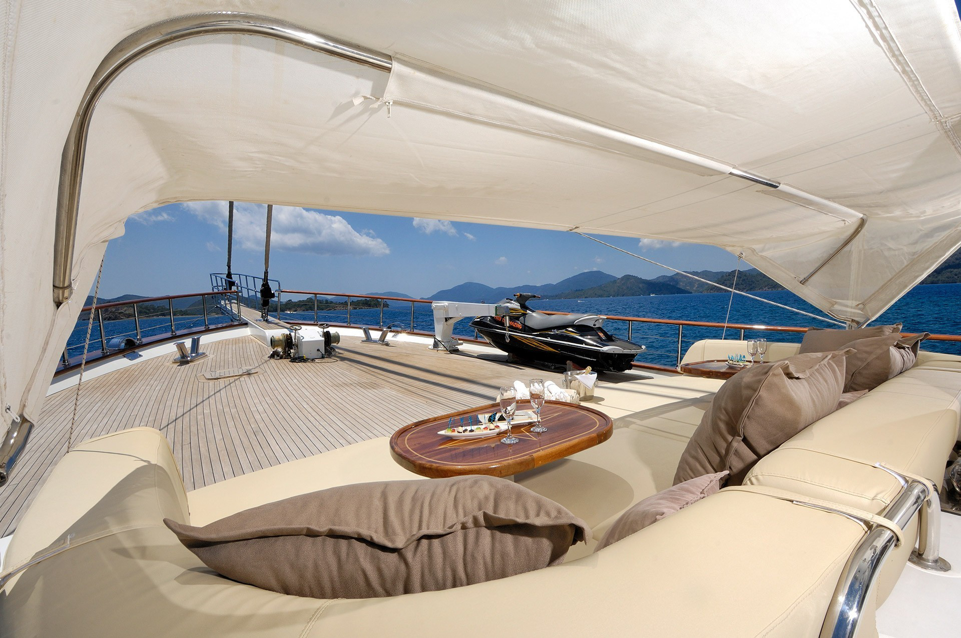 S/Y ALESSANDRO has plenty of exterior living areas, the aft deck is generous and offers 2 large side by side alfresco dining options under a fitted Bimini, further aft a fold down transom reveals steps to a large swim platform with seating, perfect for easy water access or simply lounging.