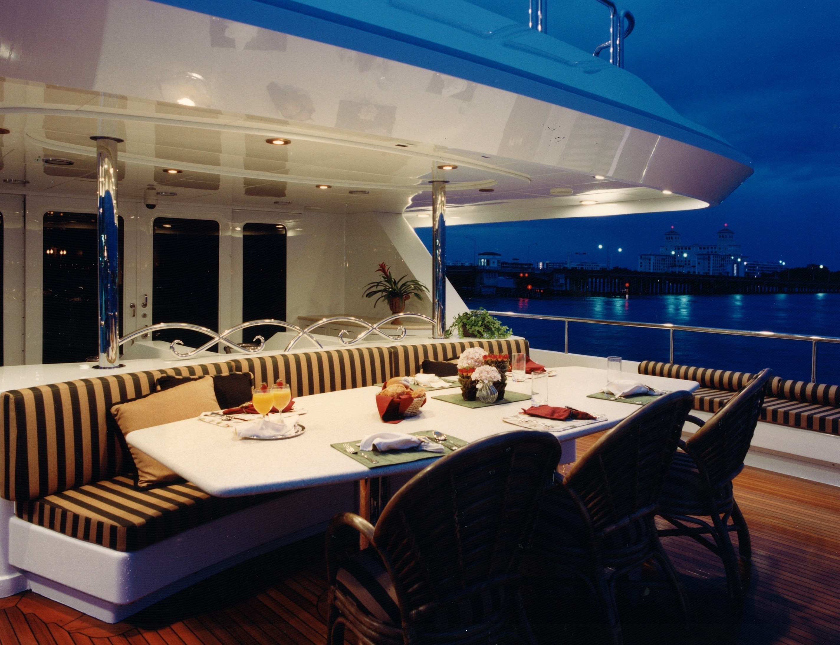 On the upper aft deck, aft of the sky lounge is an al fresco dining table, and there is also a large dining table and wet bar on the main aft deck.