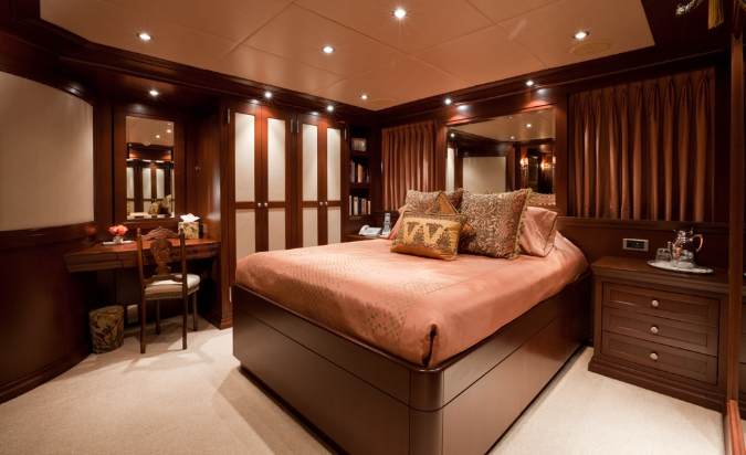 Three of the staterooms have queen beds and entertainment systems. The twin cabin has two single beds is suitable for adult guests and can also be used as a nanny or children’s cabin.
