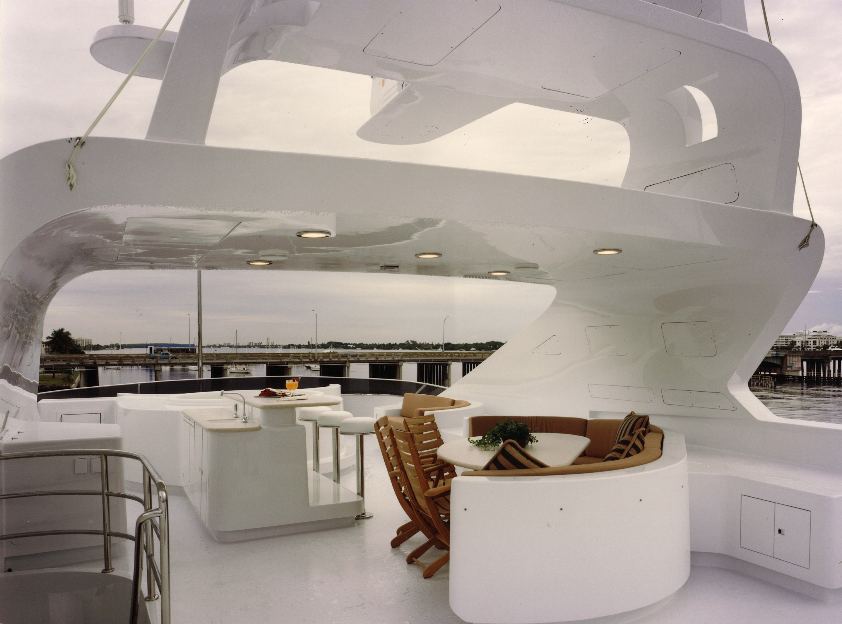 On the upper aft deck, aft of the sky lounge is an al fresco dining table, and there is also a large dining table and wet bar on the main aft deck.