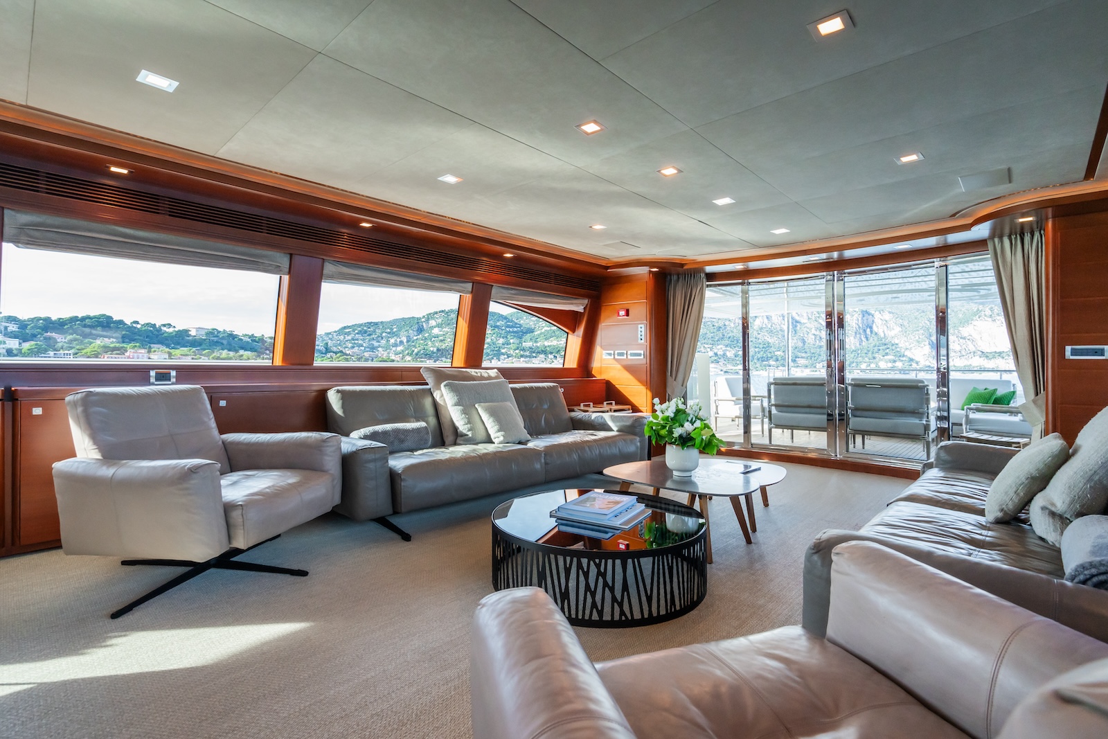 Motor yacht ROBUSTO has generous exterior living, the aft deck is shaded and offers an alfresco dining option and steps that lead to the extended swim platform, forward an additional seating area is perfect for some seclusion, ...