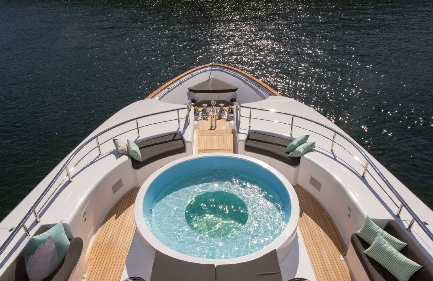 This luxury yacht boasts a full-beam comfortably furnished saloon and dining area. The salon features three comfortable couches, two occasional chairs and a coffee table.