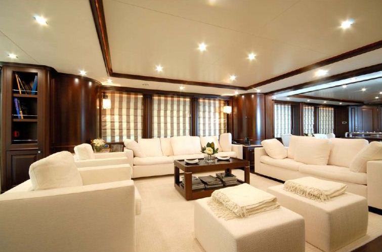 She has a large and stylish main salon with two large couches and 2 occasional chairs facing an entertainment system with large flat screen TV. The comfortable white couches and cream coloured carpets compliment her dark wood interior.