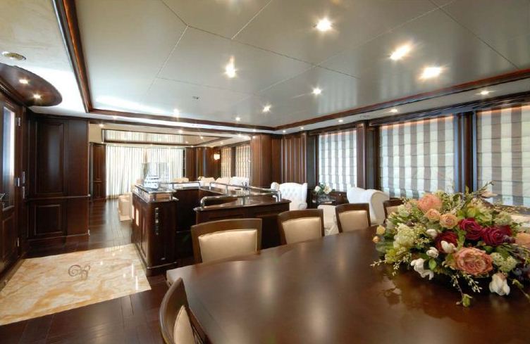 The main salon and adjoins the formal dining area, separated by the stairwell that leads to the accommodation below.