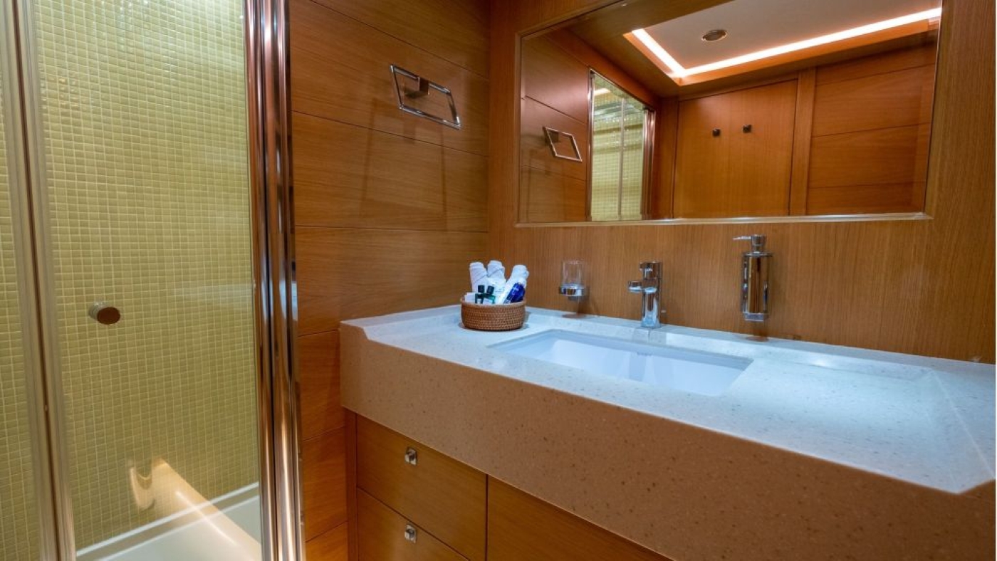 On the main deck full beam of the yacht and forward is the master suite with a king size bed, sofa, vanity and en-suite facilities with hot tub. There is a second master on the lower deck full beam of the yacht and aft, offering a king size bed, sofa, vanity and en-suite facilities.