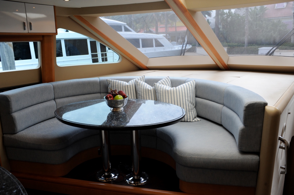 The shaded aft deck is directly adjacent to the salon and dining, making it perfect for entertaining and offers an alfresco dining option, additional seating, drop down flat screen TV and service bar area with sink.