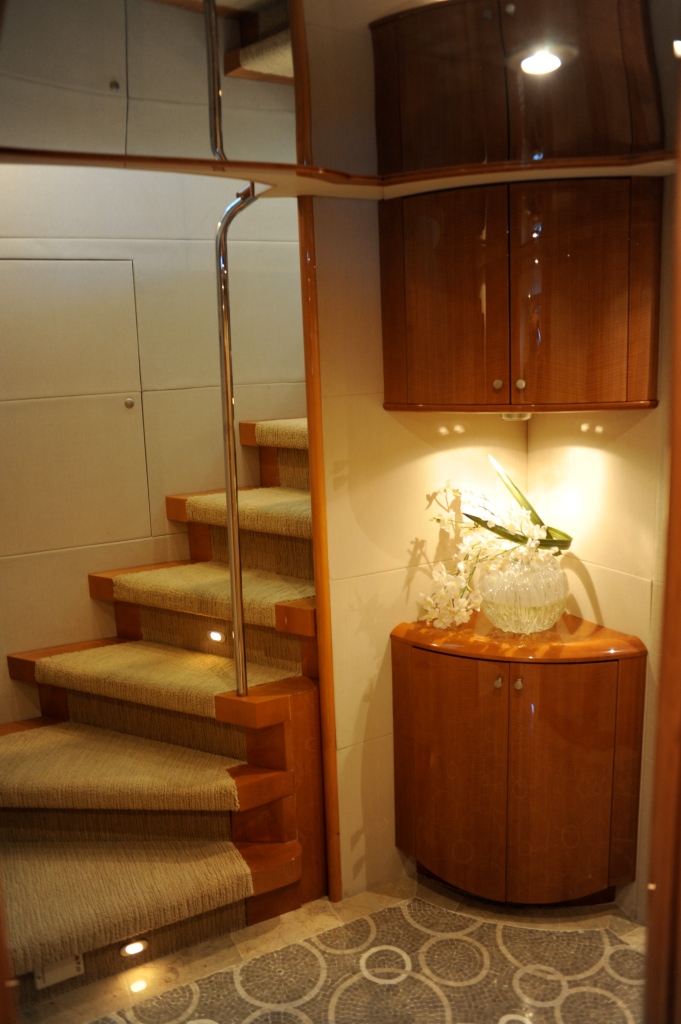 A full entertainment system boasts state of the art visual and audio equipment. Forward, the formal dining table features intricate inlays and is flanked by supple, high back leather chairs.