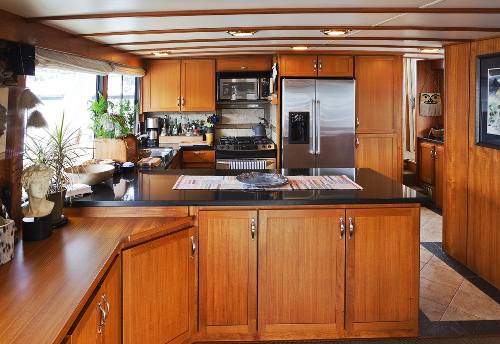 Forward of the salon is the beautifully finished galley with dark marble countertops and stainless steel appliances.