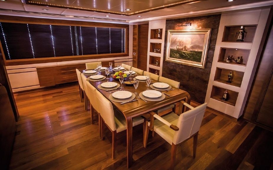 The salon and dining area semi-open plan, featuring a spacious, relaxing lounge aft, with two opposing sofas, custom coffee tables and drop down flat screen TV. Forward, the formal dining area is elegant yet modest.