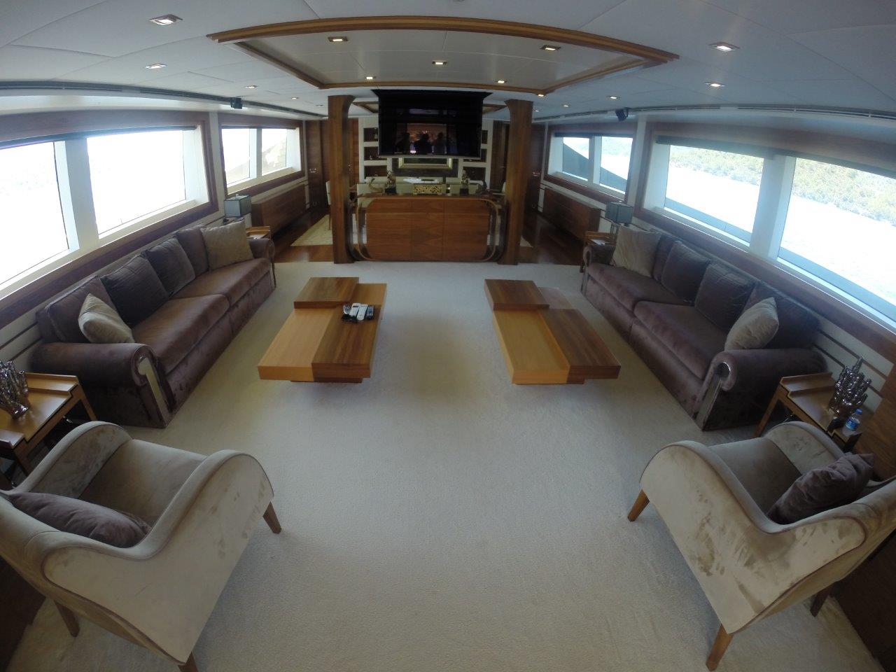 The salon and dining area semi-open plan, featuring a spacious, relaxing lounge aft, with two opposing sofas, custom coffee tables and drop down flat screen TV. Forward, the formal dining area is elegant yet modest.