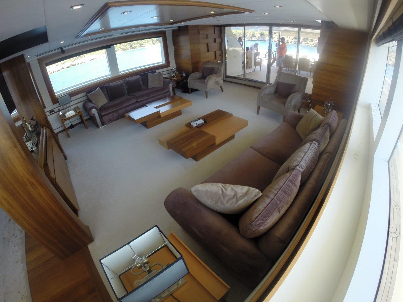 The salon and dining area semi-open plan, featuring a spacious, relaxing lounge aft, with two opposing sofas, custom coffee tables and drop down flat screen TV. Forward, the formal dining area is elegant yet modest.