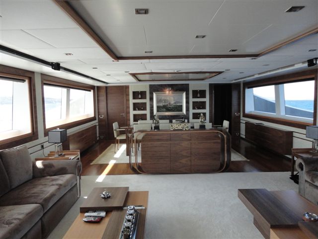 The salon and dining area semi-open plan, featuring a spacious, relaxing lounge aft, with two opposing sofas, custom coffee tables and drop down flat screen TV. Forward, the formal dining area is elegant yet modest.