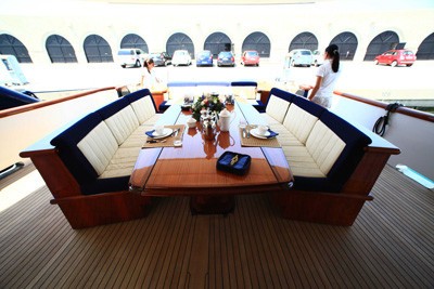 Step out from the salon through the aft glass doors onto a large aft deck which is shaded and offers an alfresco dining option at a custom built high gloss oval wood table.