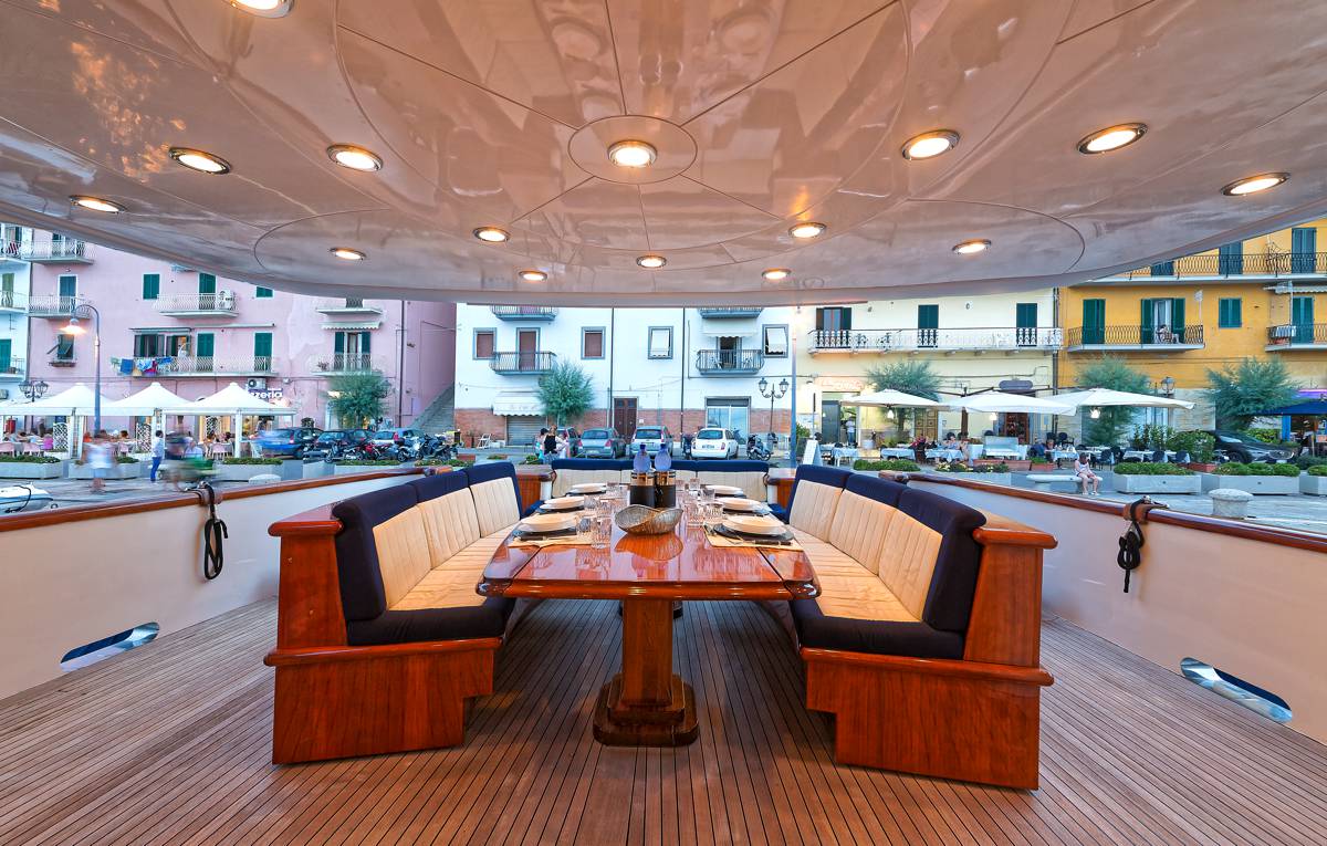 Step out from the salon through the aft glass doors onto a large aft deck which is shaded and offers an alfresco dining option at a custom built high gloss oval wood table.