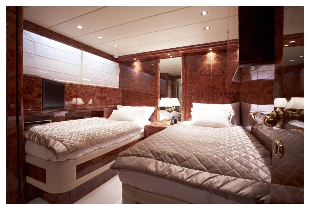 Luxury charter yacht WAI accommodates 7 guests in 2 double and 1 twin cabin. The master suite is full beam of the yacht with a centre lined double bed, sofa and en-suite facilities. A double cabin is a starboard with a double bed and en-suite facilities and the twin cabin is to port with a Pullman berth and en-suite facilities.