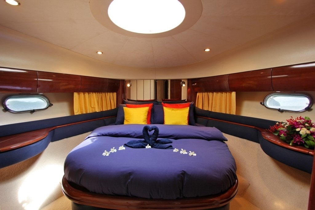 The open galley enables guests to check in on the chef’s gourmet creations. Further forward and to port is a dining table seating up to 8 guests. The yacht is fully air-conditioned and the saloon area has a full entertainment system.