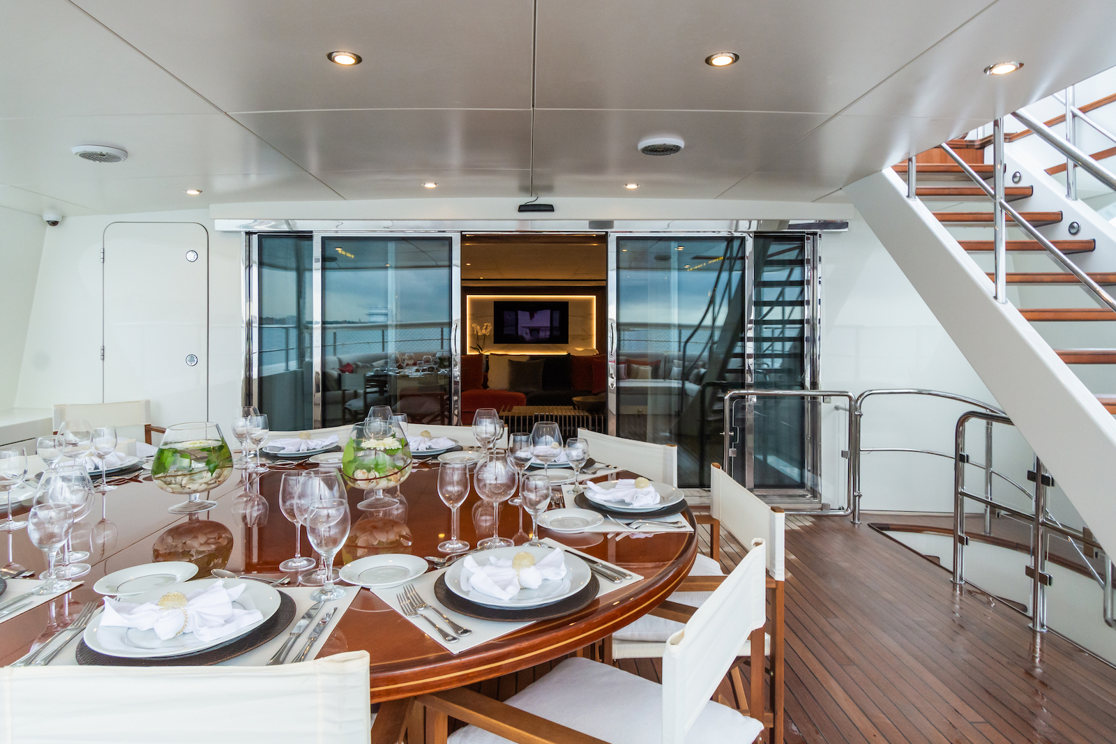 Forward on the upper deck is a cool hangout with two u shaped sofas and table while the upper aft deck offers an impressive dining setting and lounge seating.