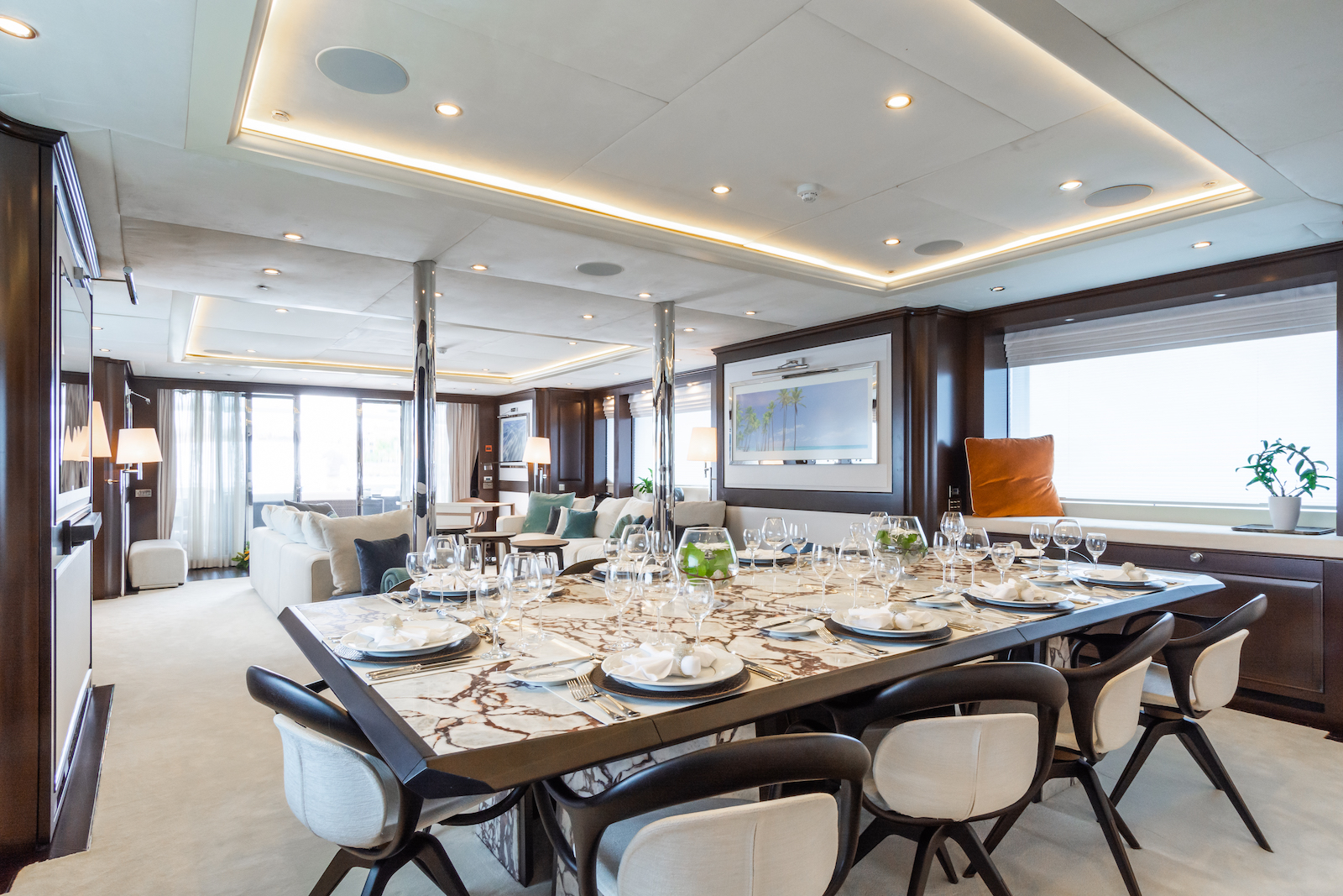 The sundeck features a jacuzzi surrounded by a wide sun padded area scattered with comfortable cushions, a covered area, and a selection of sun beds aft. Forward on the upper deck is a cool hangout with two u shaped sofas and table while the upper aft deck offers an impressive dining setting and lounge seating.