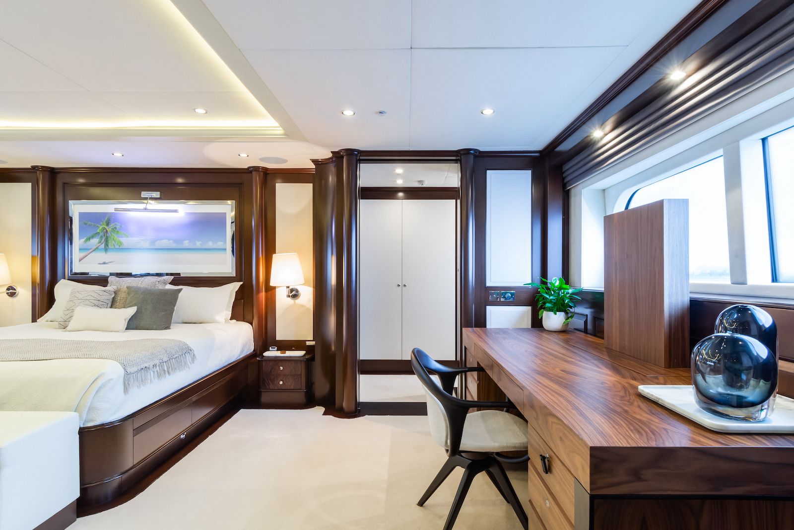 The full beam master suite is forward on the main deck while the other guest accommodation is on the lower deck.