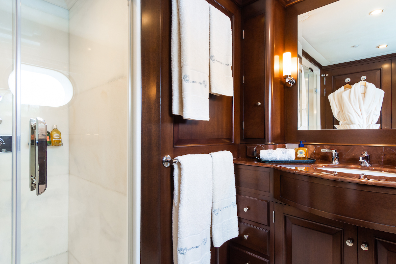 On the lower deck the additional guest suites are configured as two equal sized VIP cabins and two generous twins, all with the privacy and luxury of ensuite bathroom facilities.