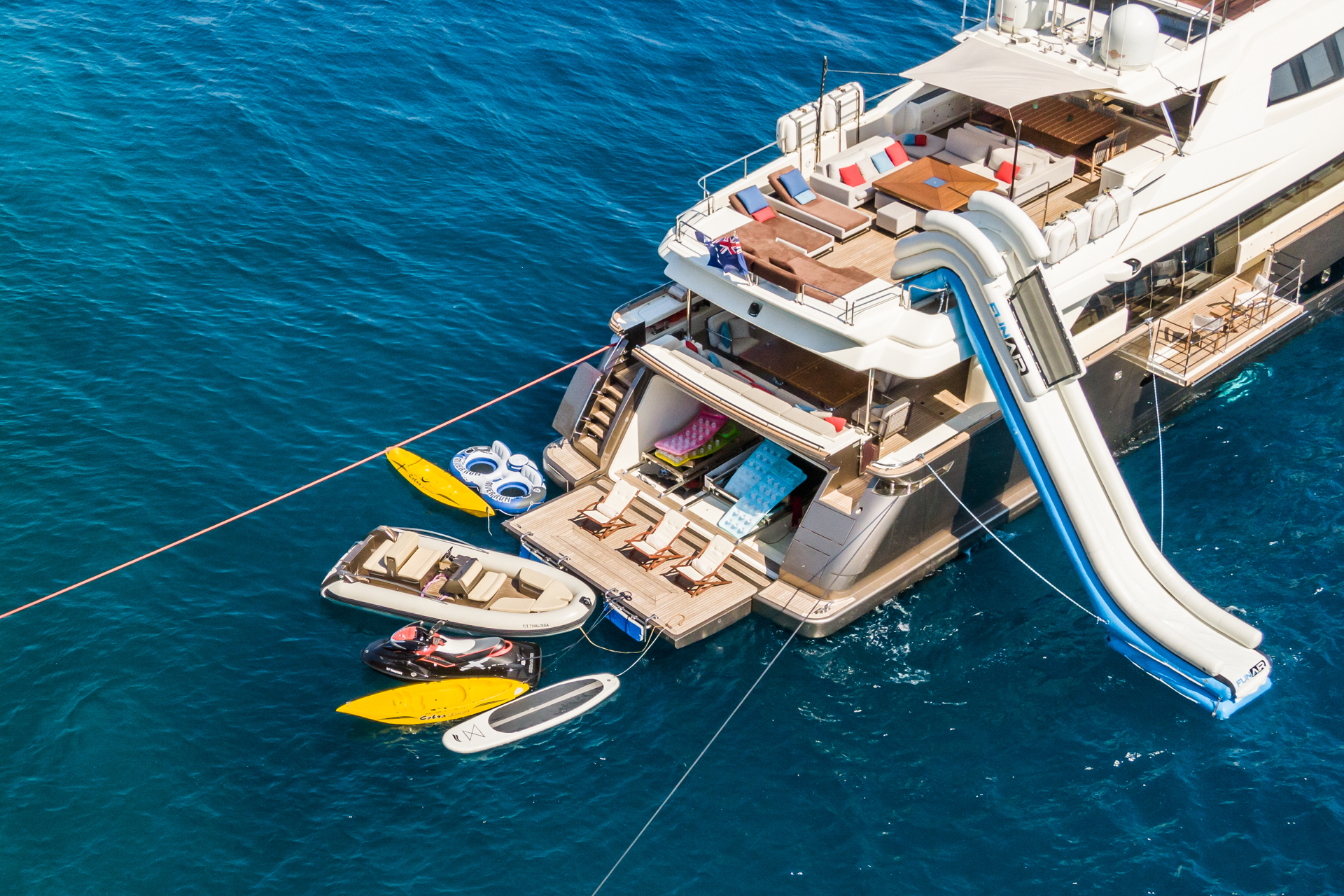 Port side steps lead down to the hydraulic swim platform which the crew can set up as a beach club with access to the great selection of water toys including a fun-air inflatable slide, jet ski, trampolines and set of wakeboards.