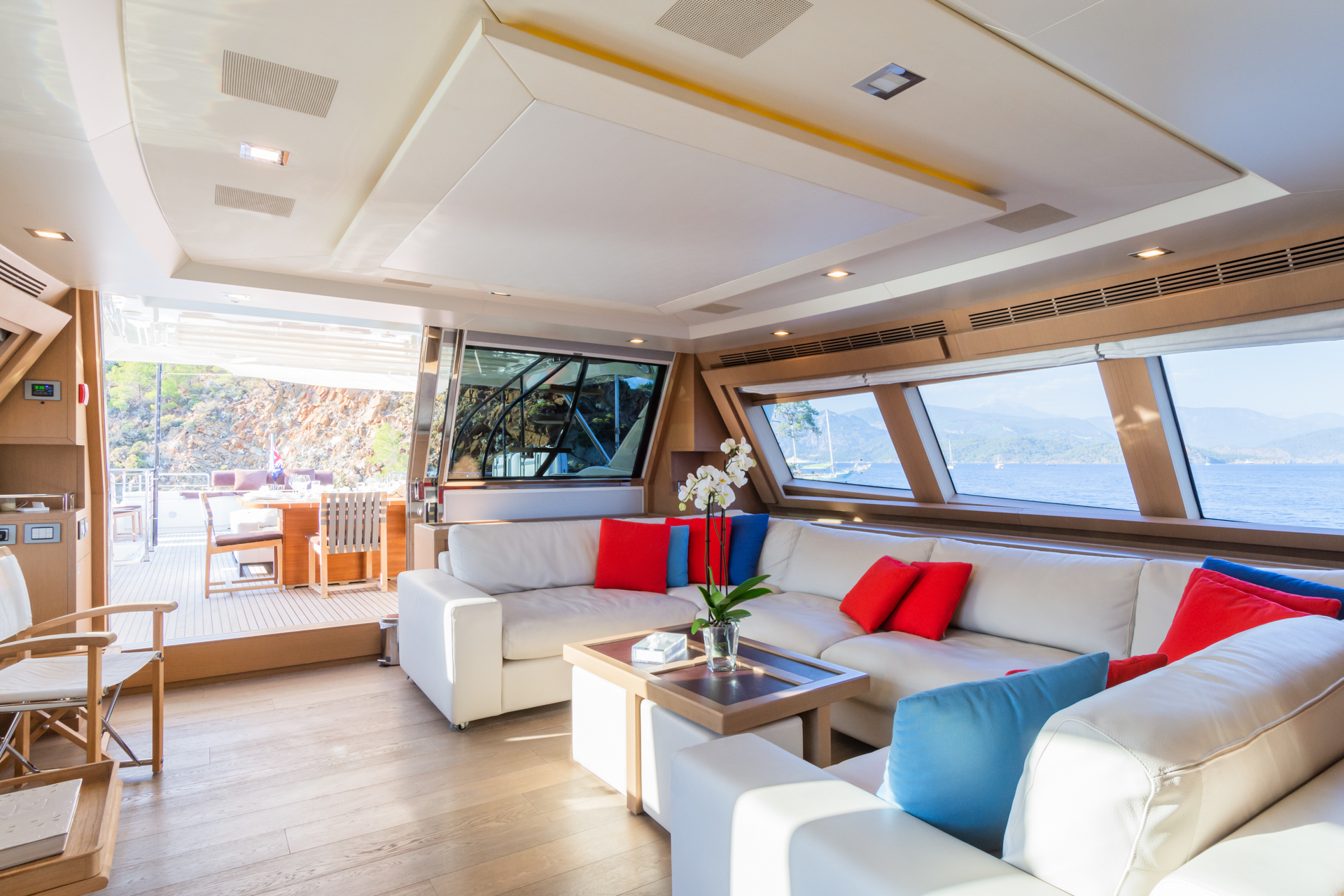 The upper deck aft is a huge sociable area with a covered dining table, lounge/dining arrangement amidships with a flexible table and aft sun beds.